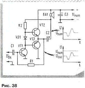 Когда же на входе усилителя действует отрицательная полуволна входного сигнала, транзисторы VT1 и VT3 закрываются, a VT2 открывается током, текущим через резистор нагрузки R2. Если его сопротивление значительно, транзистор VT2 открывается хуже, чем VT3. что приводит к ограничению положительных полуволн выходного сигнала, т.е. к искажениям. Подсоединив резистор R2 к нижнему по схеме выводу динамической головки, мы в значительной мере устраняем эти искажения, поскольку мгновенное напряжение на этом выводе при положительной полуволне выходного сигнала становится больше напряжения питания. Это и обеспечивает лучшую "раскачку" транзистора VT2.