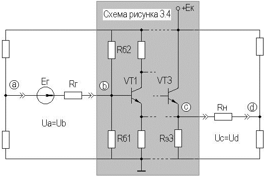 В связи с тем, что данный УПТ имеет однополярное питание, на его входе и выходе присутствует некоторый постоянный потенциал, что не позволяет подключать низкоомные источник сигнала и нагрузку непосредственно между ними и общим проводом. В этом случае используется мостовая схема с включением RГ и Rн в диагонали входного и выходного мостов (рисунок 5.2).