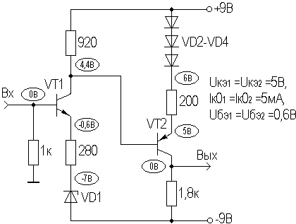 Для целей согласования потенциалов используют транзисторы различной проводимости, для лучшей температурной компенсации применяют диоды и стабилитроны. Применение двухполярного источника питания позволяет непосредственно подключать источник сигнала и нагрузку к УПТ, т.к. в этом случае обеспечены нулевые потенциалы на его входе и выходе. Указанные меры реализованы в схеме УПТ, приведенной на рисунке 5.3.
