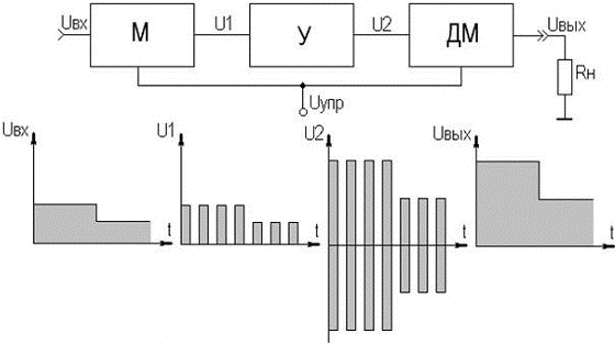 Отмеченные недостатки в значительной мере преодолеваются в УПТ с преобразованием (модуляцией) сигнала. На рисунке 5.4 приведена структурная схема УПТ с преобразованием постоянного тока в переменный и даны эпюры напряжений, поясняющие принцип его работы.