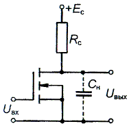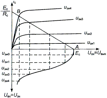 Схема ключа с резистивной нагрузкой приведена на рис. 3.6, а на рис. 3.7 показано построение передаточных характеристик. При Uзи = О режим работы ключа определяется точкой А, при этом Uвых = Ес. При увеличении Uзи рабочая точка перемещается вдоль нагрузочной линии, при этом возрастает ток ic и уменьшается напряжение.