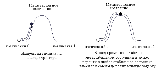 Состояние метастабильности триггера подобно неустойчивому состоянию шарика, находящегося на вершине конического холма. Такая ситуация иллюстрируется рисунком 1. Обычно триггер не может долго находиться в состоянии метастабильности и быстро возвращается в одно из стабильных состояний. Время нахождения в метастабильном состоянии зависит от уровня шумов схемы и использованной технологии изготовления микросхем.