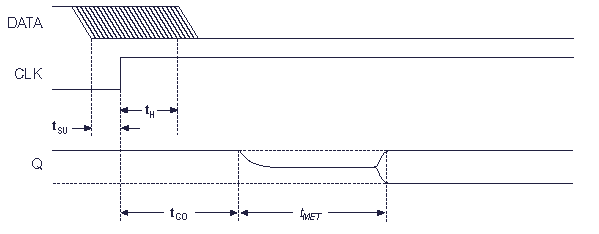 Временные параметры триггера в момент возникновения состояния метастабильности и выхода из этого состояния приведены на рисунке 2. Время tSU (register setup time or tSU) на этом рисунке это минимальное время перед синхроимпульсом, в течение которого логический уровень сигнала должен оставаться стабильным для того, чтобы избежать метастабильности выхода триггера. Время tH (register hold time or tH) это минимально необходимое время удержания стабильного сигнала на входе триггера для того, чтобы избежать метастабильности его выхода. Время состояния метатастабильности случайно и зависит от многих параметров. На рисунке 2 оно обозначено tMET.