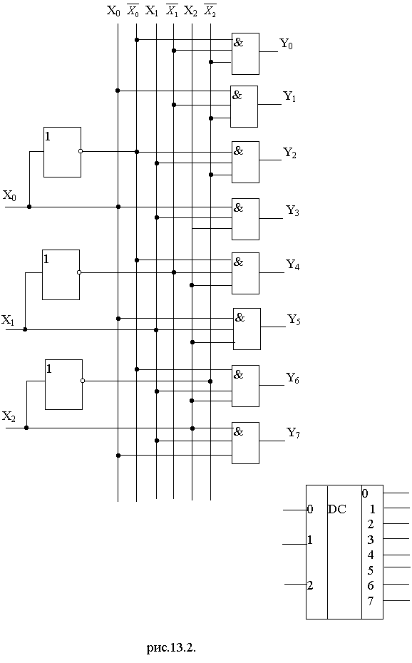 На рисунке 13.2. показаны функциональная схема и условное обозначение одноступенчатого дешифратора на 3 входа.