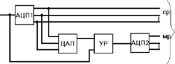 Входной аналоговый сигнал подаётся на первый АЦП, на выходе которого формируются старшие разряды выходного кода. Эти разряды подключаются также на вход ЦАП. Выходной сигнал ЦАП сравнивается в усилителе разности (УР) с входным сигналом. Разнос этих сигналов подается на вход второго АЦП, который преобразует его в выходной код младших разрядов.