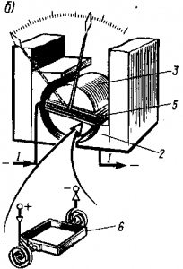 Устройство и принцип действия. Магнитоэлектрический измерительный механизм (рис. 321,а) выполнен в виде постоянного магнита 1, снабженного полюсными наконечниками 2, между которыми укреплен стальной сердечник 3. В кольцеобразном воздушном зазоре, образованном полюсными наконечниками и сердечником, помещена подвижная катушка 5, намотанная на алюминиевый каркас 6 (рис. 321,б). Катушка выполнена из очень тонкого провода и укреплена на оси, связанной со стрелкой спиральными пружинами 4 или растяжками. Через эти же пружины или растяжки осуществляется подвод тока к катушке.
