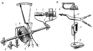 Электроизмерительные приборы обычно снабжают корректором — приспособлением, позволяющим устанавливать стрелку в нулевое положение. Корректор состоит из винта 6, выходящего из корпуса, и поводка 7, при помощи которых можно смещать на некоторое расстояние точку закрепления спиральной пружины 8, создающей противодействующее усилие. В большинстве современных электроизмерительных приборов подвижная часть 11 подвешивается на двух растяжках 10 — упругих металлических лентах, которые служат для подвода тока к катушке прибора и одновременно создают противодействующий момент (рис. 323,б). Растяжки прикреплены к двум плоским пружинам 9 и 12, расположенным во взаимно перпендикулярных плоскостях.