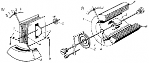 щихся пластинок 3, расположенных внутри катушки 1. Одна из них укреплена на оси прибора, а другая — на внутренней поверхности каркаса катушки. При прохождении тока по катушке пластины намагничиваются, и их одноименные полюсы оказываются расположенными друг против друга. Между ними возникают силы отталкивания и создается вращающий момент, поворачивающий ось со стрелкой 4.