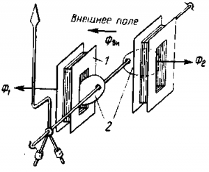 В астатическом приборе имеются две плоские катушки 1 и два сердечника 2, расположенные на общей оси (рис. 325). Обмотки катушек включают так, чтобы направления их магнитных потоков Ф1 и Ф2 были противоположны. Вращающие моменты действуют на подвижную систему прибора в одинаковом направлении. Поэтому внешний магнитный поток Фвн будет усиливать поле одной катушки и ослаблять поле другой; создаваемый же ими суммарный вращающий момент будет оставаться неизменным.