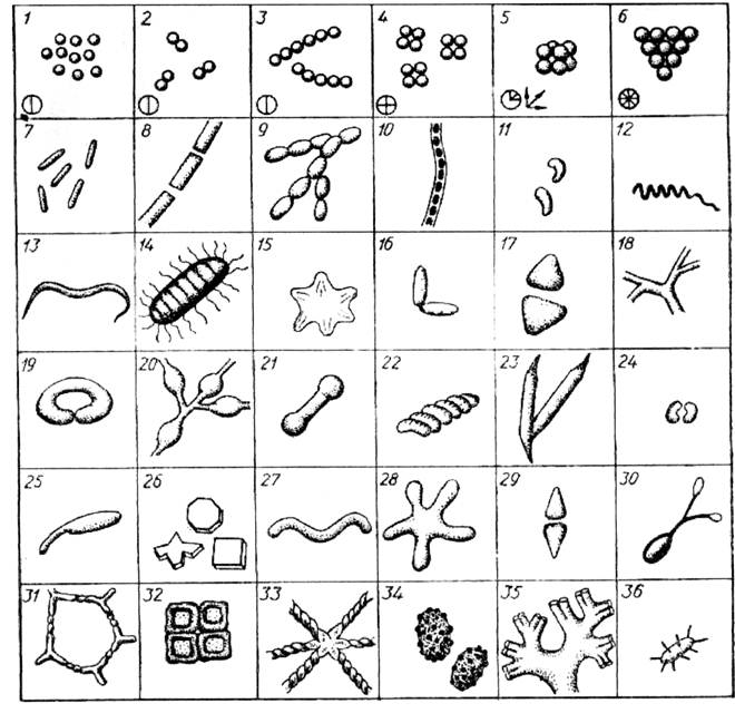1 – микрококки; 2 – диплококки; 3 – стрептококки; 4 – тетракокки; 5 – сарцина; 6 – стафилококк; 7 – маленькие палочки; 8 – большие палочки, соединенные в цепочку; 9 – яйцевидные кокки; 10 – трихомные клетки; 11 – вибрионы; 12 – спирохета; 13 – червеобразная клетка; 14 – многоклеточная форма; 15 – звездообразная; 16 – палочки, расположенные под углом друг к другу; 17 - треугольные; 18 – ветвящиеся формы; 19 – тороидальные; 20 – почкующиеся клетки; 21 - гантелевидные клетки; 22 – нецилиндрические трихомы; 23 – палочки с заостренными концами; 24 - бобовидный диплококк; 25 – клетка со стебельком; 26 – пластинчатые клетки архебактерий; 27 - спирилла; 28 – амёбоидная; 29 – ланцетовидный диплококк; 30 – клетка с гифами, на которых образуются почки; 31 – цепочка клеток, образующих петлю; 32 – соединение клеток в пластинки; 33 – звездообразная розетка из клеток; 34 – тубероидальные клетки; 35 – слизистые стебельки бактерий; 36 – клетки с шипами.