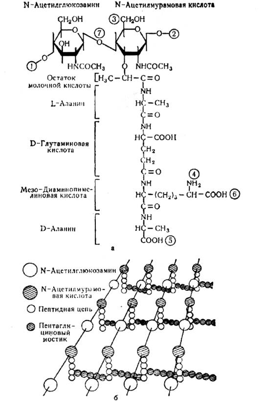 Рисунок А..2 – Повторяющаяся единица пептидогликана (а) клеточной стенки прокариот и схематическое изображение общей структуры (б)