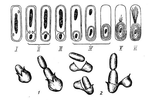 I-IV - стадии образования эндоспоры; 1 – полярное прорастание эндоспоры; 2 – латеральное прорастание эндоспоры.