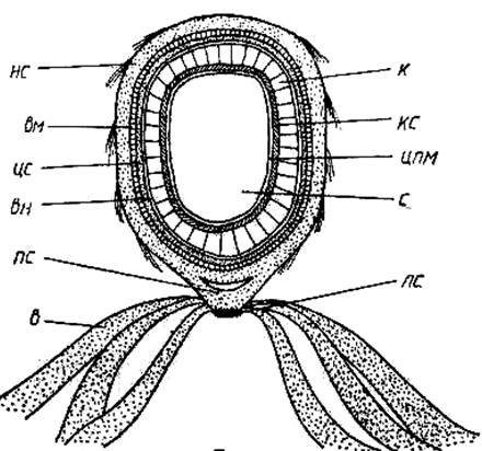 с – спороплазма, цпм – цитоплазматическая мембрана; кс – клеточная стенка; к – кортекс; вн - внутренний слой споровой оболочки; нс – наружный слой споровой оболочки; цс – слой цитоплазмы между внешней мембранорй споры и ее оболочкой; вм – внешняя мембрана споры; пс – подушечка споры; лс - линзовая структура, состоящая из гранулярного вещества; в – выросты споры.