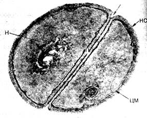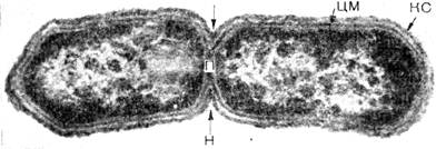 1- деление перетяжкой; 2 – деление поперечной перегородкой; КС – клеточная стенка; ЦП - цитоплазматическая мембрана; Н – нуклеоид; П – перетяжка (вверху), перегородка (внизу).