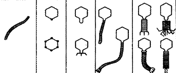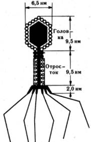 1 - схема строения фага; 2 - адсорбция фага на поверхности клетки; 3 - морфологические типы фагов.