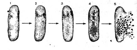 1 – внедрение; 2 –эклипс-фаза; 3, 4 – созревание; 5- выход фага.
