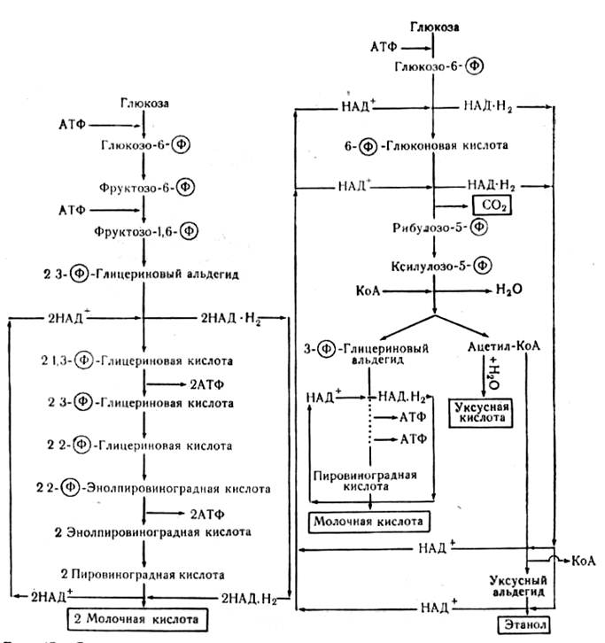 1 – гомоферментативное брожение; 2 – гетероферментативное брожение.