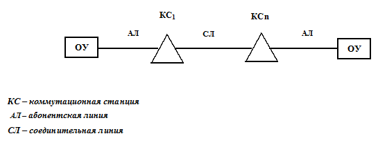 На входе и на выходе сети связи включаются оконечные устройства, обеспечивающие преобразование сообщений в электрические сигналы и обратное преобразование. Оконечные устройства соединяются с коммутационной станцией абонентскими линиями. Коммутационные станции между собой связаны соединительными линиями. Коммутационные станции осуществляют соединение входящих линий с исходящими линиями по соответствующему адресу.