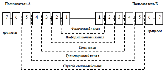 Пользователи для организации взаимодействия опираются на службу взаимодействия. Взаимодействие между пользователями организуется средствами управления сеансами (уровень 5), которые работают на основе транспортного канала, обеспечивающего передачу сообщений в течение сеанса. Транспортный канал, создаваемый на уровне 4, включает в себя сеть связи, которая организует информационные каналы между пользователями (рисунок 1.10).