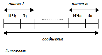 2) Коммутация пакетов – исходящее сообщение делится на «пакеты», каждый из которых содержит часть полезной информации и заголовок (рисунок 1.13). Заголовок первого пакета содержит характеристику сообщения: адреса исходящего, входящего пунктов, количество пакетов в сообщении и другое. В остальных пакетах в заголовок может включатся идентификатор, определяющий принадлежность пакета к сообщению, порядковый номер пакета.
