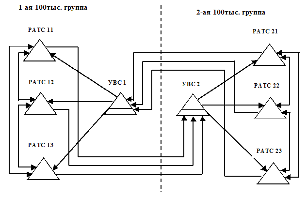 При таком построении сети территория города делится на узловые районы. Внутри узлового района РАТС связываются по принципу «каждая с каждой». Связь между РАТС разных узловых районов осуществляется через УВС (рисунок 2.4).