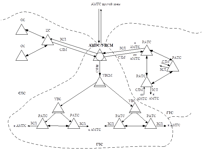 Наиболее распространенным вариантом организации внутризоновой сети является вариант с одной АМТС в зоне. В этом случае внутризоновая сеть строится по радиальному принципу, где роль узла выполняет АМТС, которая также является оконечной станцией междугородной сети. В АМТС включаются центральные станции (ЦС) сельской сети и РАТС городской сети. РАТС соединяются с АМТС либо непосредственно, либо, через узлы городской сети (УИС и УВС). Между местными сетями и АМТС имеются соединительные линии: