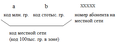 В качестве первой цифры а могут быть использованы любые цифры, кроме 0 (в дальнейшем 1) и 8 (в дальнейшем 0). В стотысячной группе номер пятизначный ххххх. Так как число стотысячных групп в зоне нумерации не может превышать 80, то максимальная емкость внутризоновой сети 8 млн. номеров.