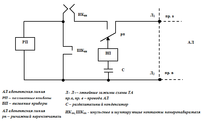 Номеронабиратель передает на станцию адресную информацию – номер вызываемого абонента. В схему телефонного аппарата включаются импульсные и шунтирующие контакты номеронабирателя (ИК и ШК). ИК формируют сигналы набора номера, а ШК шунтируют разговорную часть схемы на время передачи цифры для того, чтобы она не влияла на параметры передаваемых сигналов.