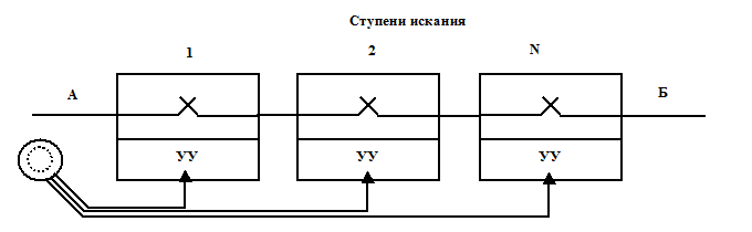 2) косвенное (регистровое) управление (рисунок 4.19), при котором адресная информация запоминается в регистре, а затем распределяется по УУ ступеней искания.