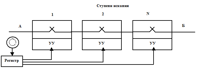 2) обходной, при котором процесс выбора выхода отделен от процесса установления соединения и применяется в системах с групповыми УУ. Коммутационный прибор выполняет функции соединения входы с выходом, а выбор требуемого соединительного пути между входом и выходом выполняет УУ.