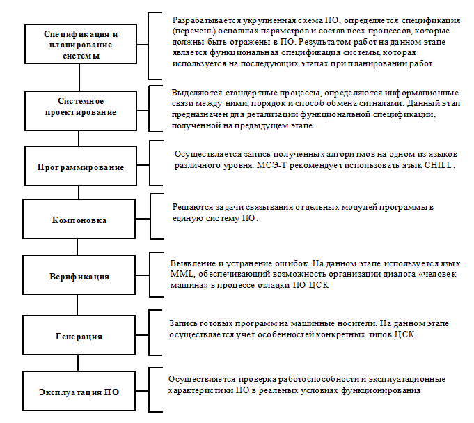 Процесс проектирования (разработки) АО и ПО является многоэтапным, иерархическим, итеративным и в соответствии с рекомендациями ITU-Т (МСЭ-Т) ведется методом «сверху вниз». Это способ поэтапной абстракции с возрастающей последовательной детализацией. Этапы проектирования АО и ПО иерархически упорядочены так, что результаты выполнения данного слоя (уровня) детализируют проектные решения предшествующего уровня и являются исходными данными для следующего, более низкого уровня. Этапы проектирования связаны не только в прямом (от более высокого уровня к более низкому), но и в обратном направлении. Обратные связи используются для уточнений и улучшений проектных решений, что позволяет найти окончательное решение методом последовательных приближений. Последовательность этапов проектирования ПО показана на рисунке 6.23.