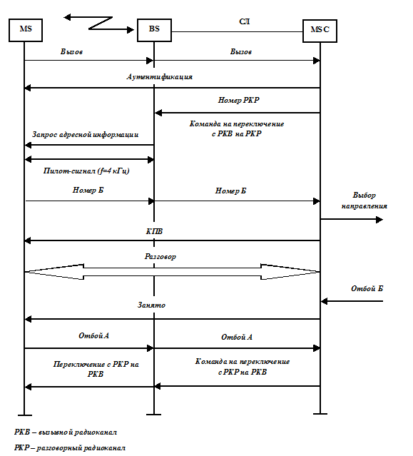Центр коммутации закрепляет за абонентом свободный разговорный канал (РКР) и сообщает его номер базовой станции вместе с командой на переключение абонента с РКВ на РКР. После выполнения этой команды базовая станция выдает MS команду на передачу адресной информации и вводит в РКР сигнал для контроля местонахождения (пилот-сигнал, f=4 кГц).