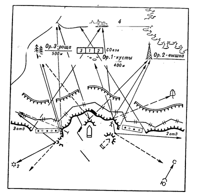 В ходе рекогносцировки, проводимой командиром взвода, командир отделения принимает решение, а затем указывает личному составу место для позиции отделения, где иметь основные и запасные огневые позиции для БМП (БТР), гранатометчика, пулеметчика и места автоматчикам. После этого он отдает боевой приказ, организует инженерное оборудование и маскировку позиции, определяет расстояния до ориентиров, готовит данные для ведения огня днем и ночью и составляет карточку огня (рис. 1).
