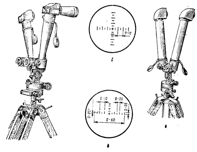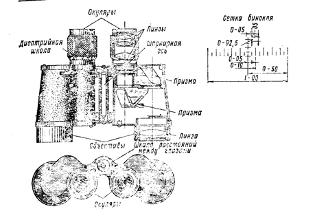 Бинокли (рис. 3) могут быть шести- (Б-6), восьми- (Б-8, Би-8), двенадцати- (Б-12) и пятнадцатикратного (Б-15) увеличения. Они имеют массу 0,6—0,9 кг. Во всех биноклях в правой трубе помещена углоизмерительная сетка для измерения горизонтальных и вертикальных углов. С помощью сетки бинокля можно производить измерение углов с точностью до 0-03 и определять расстояния до наблюдаемых целей с точностью до 3% измеряемой дальности.