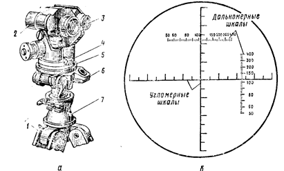 а—внешний вид; б—сетка буссоли; / — треногп: 2 — патрон с эл^К1рол.!МпочкоД для пидсве1ки сетки; 3 —барабан вертикальной иаиодкн: -?—буссолыюе кольцо' 5— угломерное кольцо; 6— ориентир бусгиль; 7 —^а.мьмная чашки