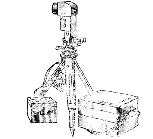 массу 2,5 кг (с треногой—5 кг) и позволяет измерять дальности от 145 м до 20 км с ошибкой ±10 м, углы—с точностью до 0-03. Подготовка прибора к работе и его использование осуществляются согласно памятке расчету, имеющейся в комплекте.