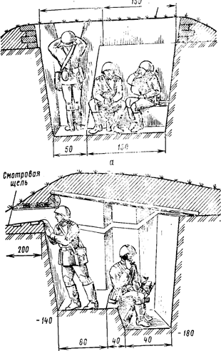 Место для наблюдательного поста оборудуется его личным составом без прекращения наблюдения. Окоп для НП может быть открытым или с противопульным (протиаооско-лочным) перекрытием и смотровой щелью (рис. 55). В лесу наблюдательный пост может располагаться на дереве (группе деревьев).