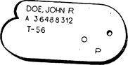 Дополнительными источниками получения разведывательных сведений в тылу противника могут быть захваченные документы, письма, газеты, обрывки записей, предметы обмундирования, снаряжения, следы, оставленные техникой..Так, например, все военнослужащие вооруженных сил США могут иметь при себе следующие документы: личный знак, удостоверение личности, расчетную книжку, продовольственный аттестат, а также увольнительную записку, водительские права и некоторые другие временные документы. Каждый военнослужащий в полевых условиях имеет при себе в обязательном порядке личный знак (рис. 61), который представляет собой металлическую пластину с выбитыми на ней фамилией, именем и первой буквой второго имени владельца, личным номером, датой противостолбнячной прививки, группой крови и вероисповеданием.