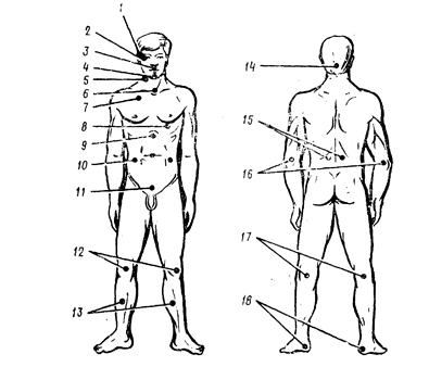 /—височная обллсть:.)—глпч;!: 5—носогуоиля склплка: •?— подбородок; 5— сонная артерии: л— •-';[) гун!,, 7—ключица: V — Область ссрдця: 9— солнечное сплстгнш': Н'— прасое и";1ре-берье (печень); //—пз.хопля область: /-'—^'плгно; /•'?—голень: