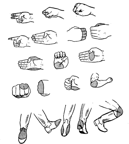 Удары руками наносятся: пальцами—в глаза, переносицу, горло; кулаком—прямые, боковые и снизу в голову, солнечное сплетение, печень, область сердца, нижнюю часть живота, сверху по голове, ключице, носу, шейному отделу позвоночника, почкам, печени; назад с поворотом по пере-- носице, ключице; ребром ладони—наотмашь по переносице, горлу, шее, виску, печени, почкам; сверху по ключице, шее, почкам; снизу по горлу, в промежность; основанием ладони—в верхнюю челюсть (область носа); локтем—по голове, в область сердца, солнечное сплетение, нижнюю часть живота, по почкам, печени и другим местам в зависимости от положения нападающего и противника.