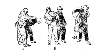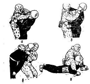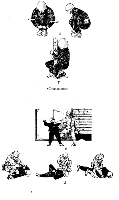 а—ударом нсгои и голову; б—ударим сгииоц п [Ю;1Колч'нпь!П сгиб; в—противник оказыйасг сопротивление развцлчику
