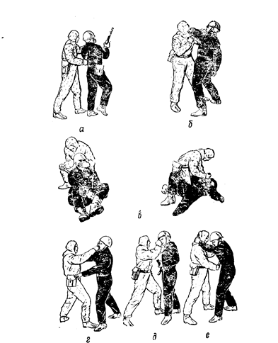 Освобождение от противника при конвоировании пол угрозой оружия (рис. 117, б}: с постепенным замедлением шага, спотыкаясь или резко остановившись, выполнить отбив ступней правой ноги с поворотом назад, захватив левой рукой запястье с оружием, нанести удар рукой в пах и выполнить бросок «мельница» с дальнейшим добиваиием ногой и изъятием оружия.