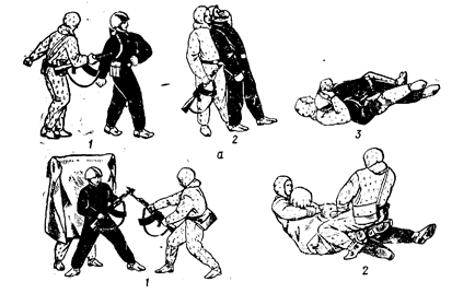 | Рис. 118. Освобождение при конвоировании вдвоем: а — сзади и впереди; б — сбсжу и сзади |