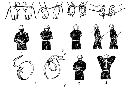 Связывать пленного можно любой крепкой веревкой, шнуром, ремнем, кабелем, скрученным широким бинтом (рис. 113).