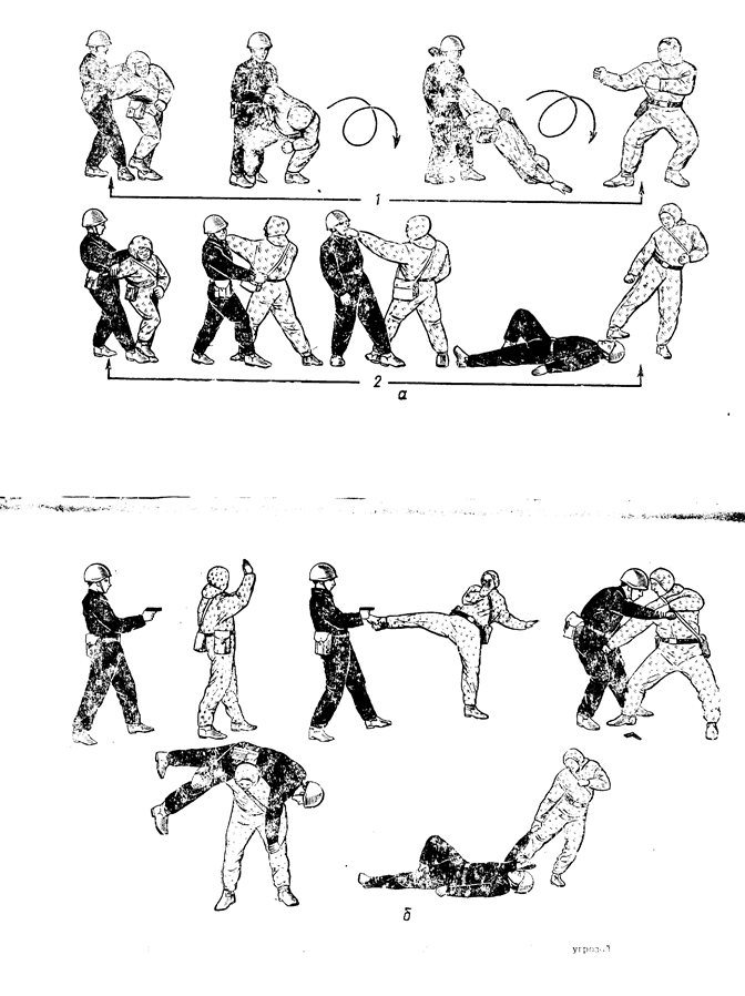 | Рис. 117. Освобождение при конвоировании: О, — загибом руки за спину: 1 — кувырком вперед; 2 — скручиванием; б — под угро,-!.;"' оружия |