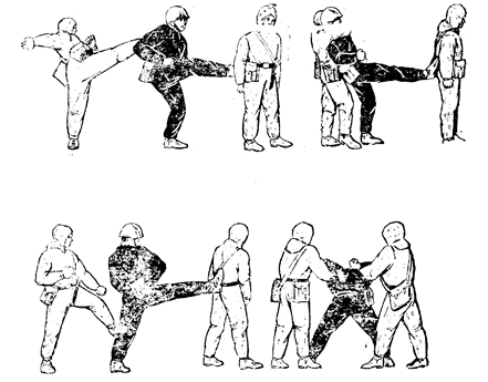 Рис. 120. Выручка и взаимопомощь при попытке противника ударить ногой: