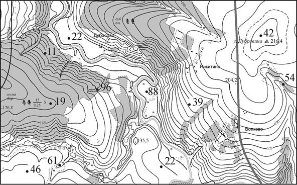 Рис. 1. Фрагмент топографической карты с точками наблюдений
