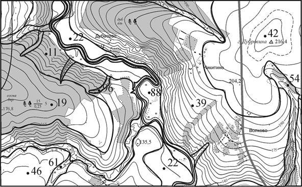 Определение мезоформы рельефа следует начинать с изучения имеющейся у каждого студента крупномасштабной топографической карты с нанесенными на ней точками наблюдений (рис. 1). Необходимо внимательно проанализировать абсолютные отметки и рисунок горизонталей на участке, где расположены точки наблюдения, и для каждой из них определить мезорельеф. Так, точки, лежащие на абсолютных высотах 150–200 м, следует относить к равнинным территориям и присваивать им соответствующие названия (например, плосковолнистые равнины, волнистые равнины и т. д.), а точки с абсолютными высотами более 200 м – к возвышенностям. Именно к такой ступени высот приурочены обычно камовые и моренные холмы и гряды.