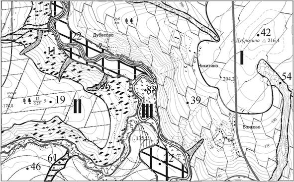 Рис. 2. Топографическая карта с границами урочищ в пределах вогнутых и плоских элементов рельефа