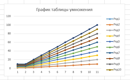 Затем следует выделить вё поле данных кроме ячеек A1 и A2 открыть Данные → А что если → Таблицы данных откроеться окно подстановки данных туда заносим значения: По столбцам из ячейки A2, по строкам из ячейки A1 и нажимаем ОК таблица заполница данными автоматически, это видно из рисунка 10 и 11. На рисунке 12 приведен график построенный на основе таблицы умножения.
